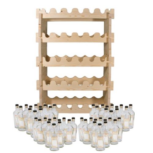 В комплект «Аляска» входит 48 бутылок из прозрачного толстого стекла и удобная деревянная полка под винные бутылки из соснового дерева. Долговечная сосна не потеряет прочность даже спустя много лет, а благодаря небольшому размеру полка не займет много места. Привлекательный внешний вид позволяет размещать ее не только в погребе или подвале, но даже на кухне, так как она способна вписаться в различные интерьеры. Каждая бутылка поставляется в комплекте с пробкой, которая надежно герметизирует содержимое. Помимо этого, в комплект входят наклейки, на которых можно подписывать содержимое тары.