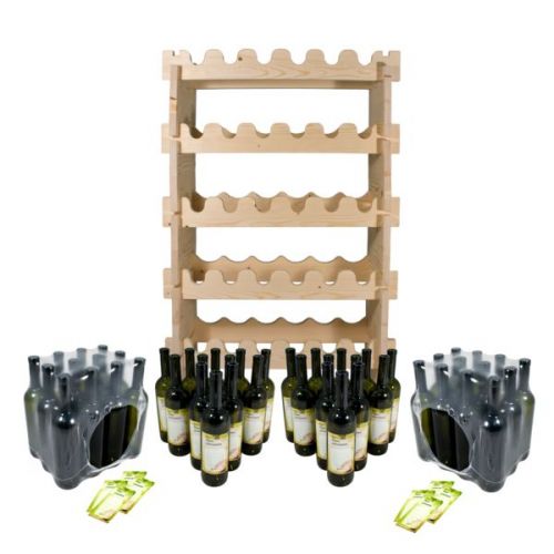 Комплект «Тоскана» состоит из полки-подставки для бутылок вина, изготовленной из сосны, а также 48 винных (непрозрачных) бутылок с пробками и наклейками. Герметичные агломерированные пробки с термоусадочными колпачками надежно запечатают содержимое на длительный срок, а самоклеящиеся наклейки позволят не забыть дату розлива и название. Комплект прекрасно подходит для хранения белого и красного вина, не занимает много места в доме, а также может располагаться как теплом, так и прохладном помещении.
