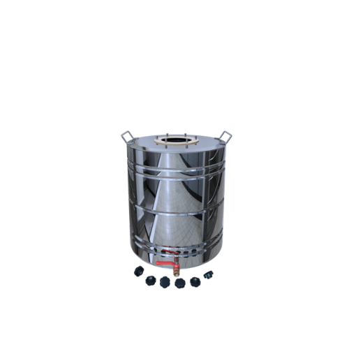 40-литровый бак из пищевой нержавеющей стали с герметичной крышкой можно использовать в качестве перегонного куба. Ребра жесткости на стенке увеличивают прочность всей емкости без увеличения толщины листа и веса конструкции.